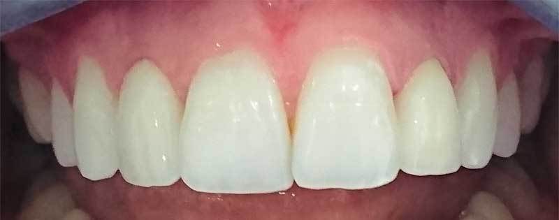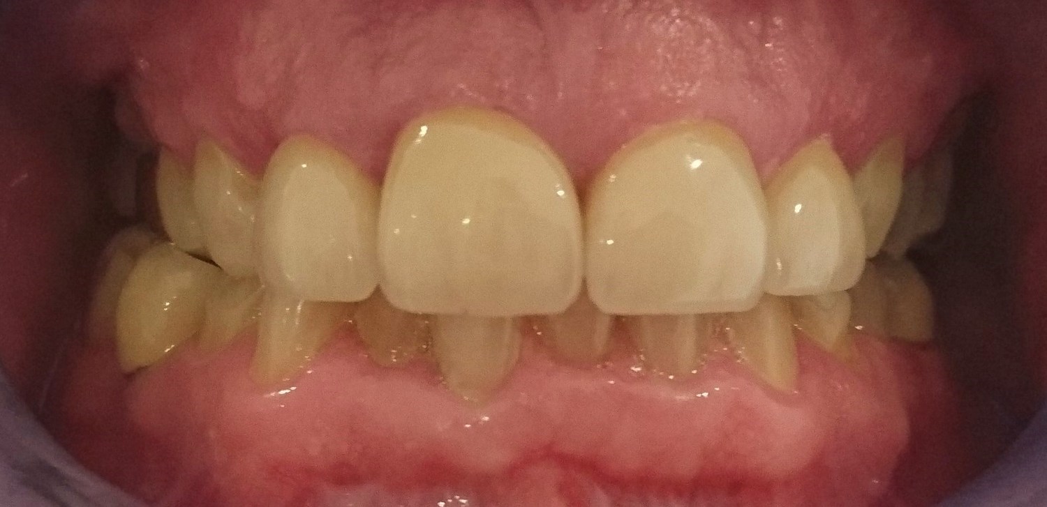 Miss H was unhappy about the colour of her teeth and the position of both heavily restored lateral incisors (the teeth next to the central incisors). After discussing a few options we agreed the best treatment was tooth whitening and to crown both laterals. With this approach and over a few visits we bighted the teeth and achieved a lovely symmetrical arch alignment.