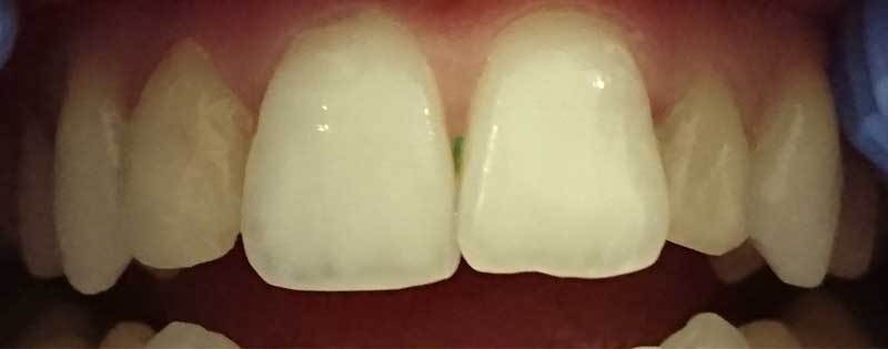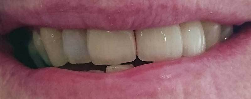 Mrs W was primarily concerned by her upper teeth, both the position and appearance of the upper incisors and the need for a small upper denture to replace the missing left lateral. Not wanting to go through the lengthy procedure of orthodontics and given that both central incisors were heavily restored we devised a treatment plan to not only improve the appearance but to also remove the need for a denture. Both centrals where crowed and a cantilever bridge from the canine designed to close the gap. The end result gives an attractive symmetry to the upper arch that had not been present before.