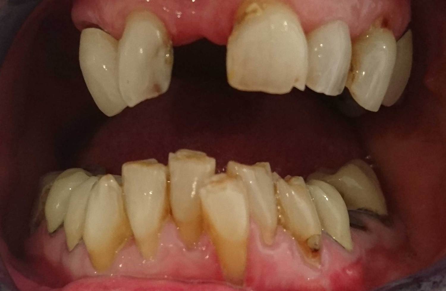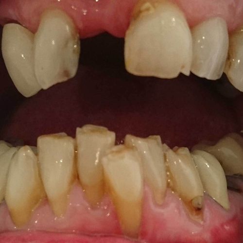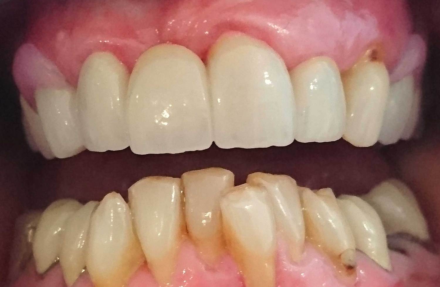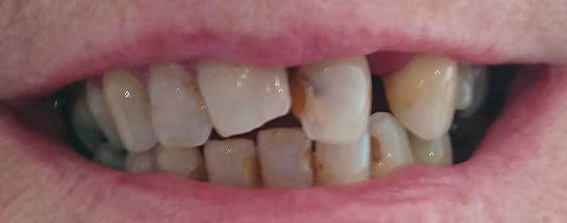 Mr T was an extremely complex case. After years of heavy wear and attrition Mr T was left with shortened and crumbling teeth and an excessive closure of the mouth. After careful treatment planning we began to reposition the jaw relationship using white fillings to rebuild the height of the teeth. Once this new jaw relationship became established sufficient space was achieved to allow for crowning of the anterior teeth. Heavily worn and filled teeth at the back of the mouth were then crowned thus stabilising the new bite and preventing Mr T from overloading his new anterior crowns.