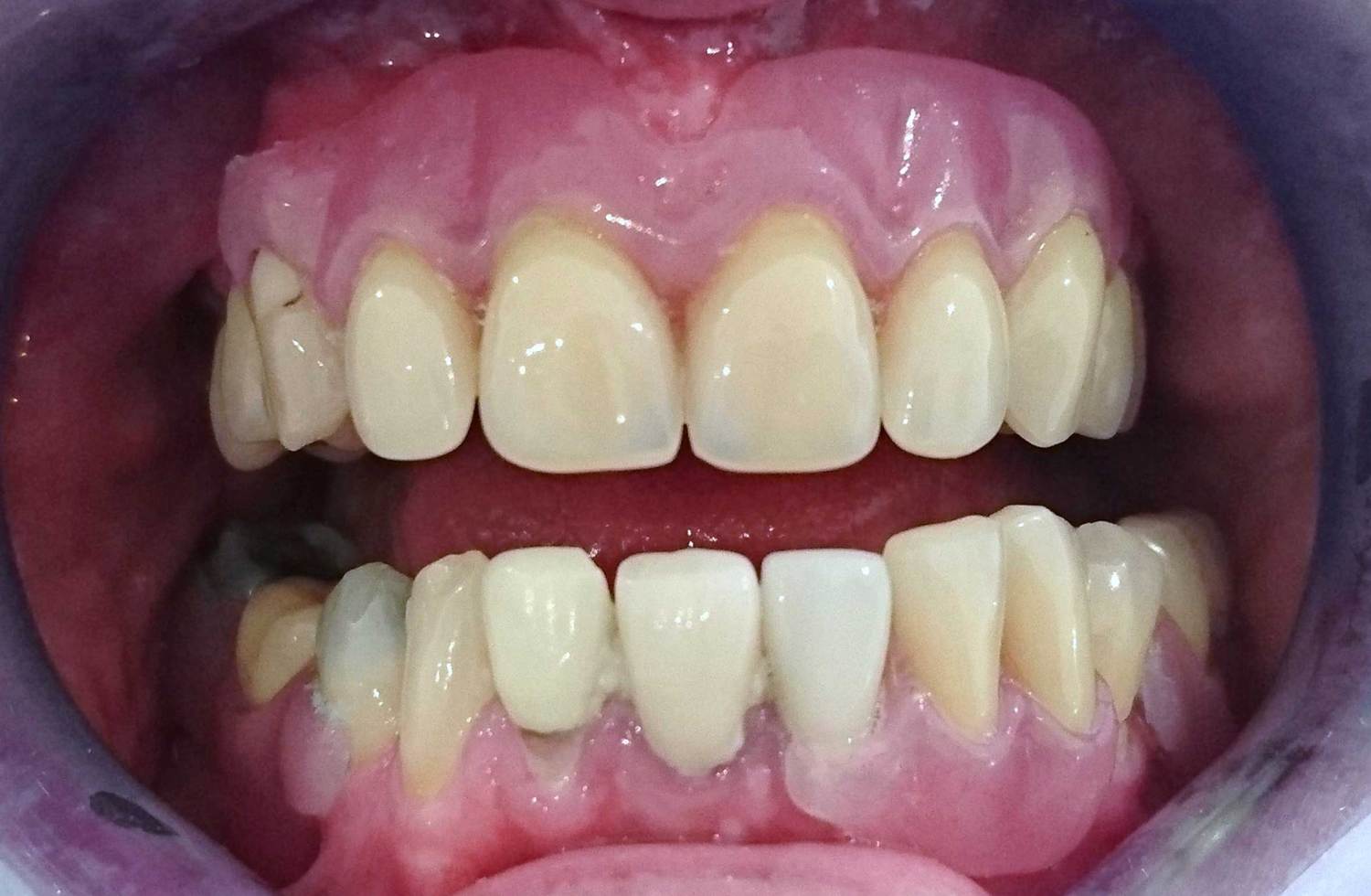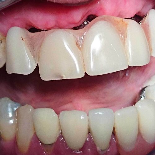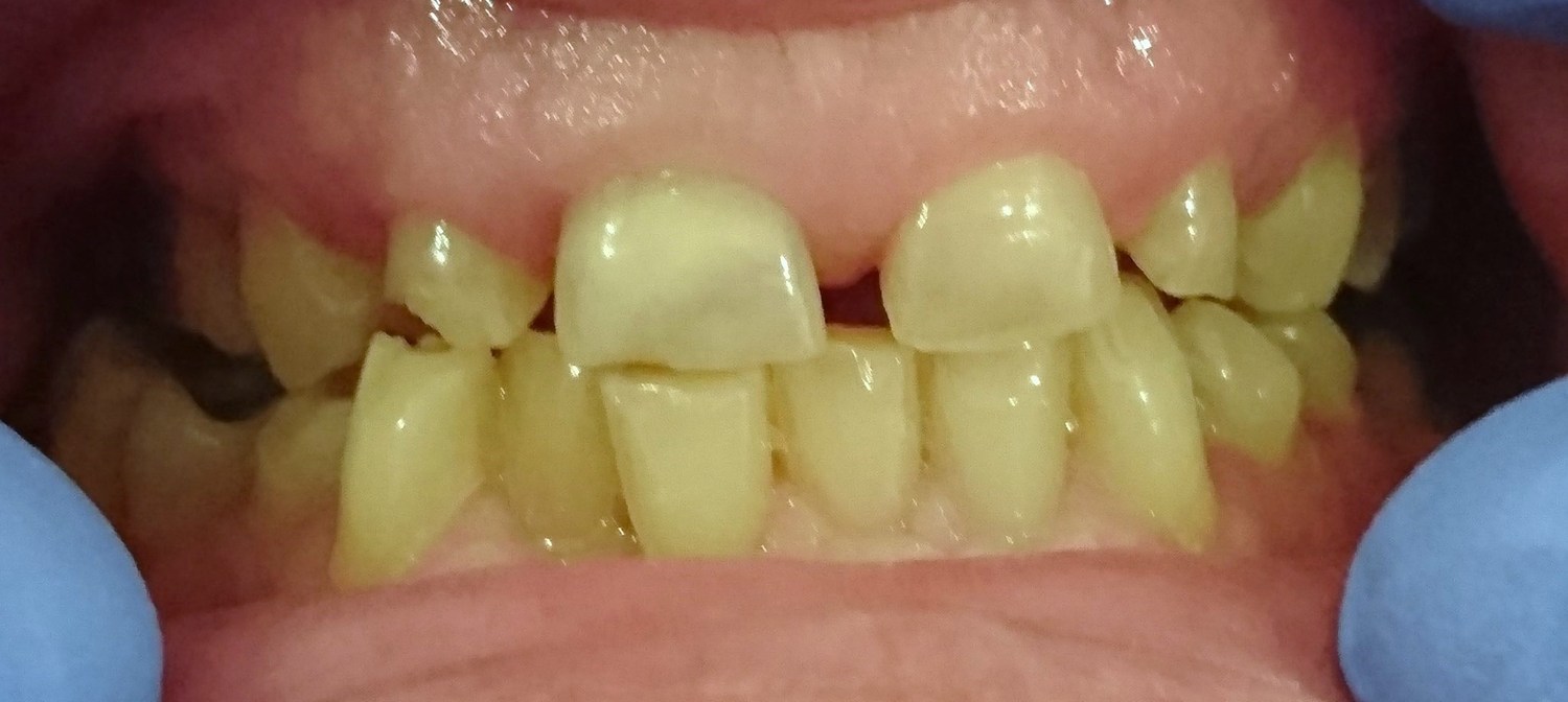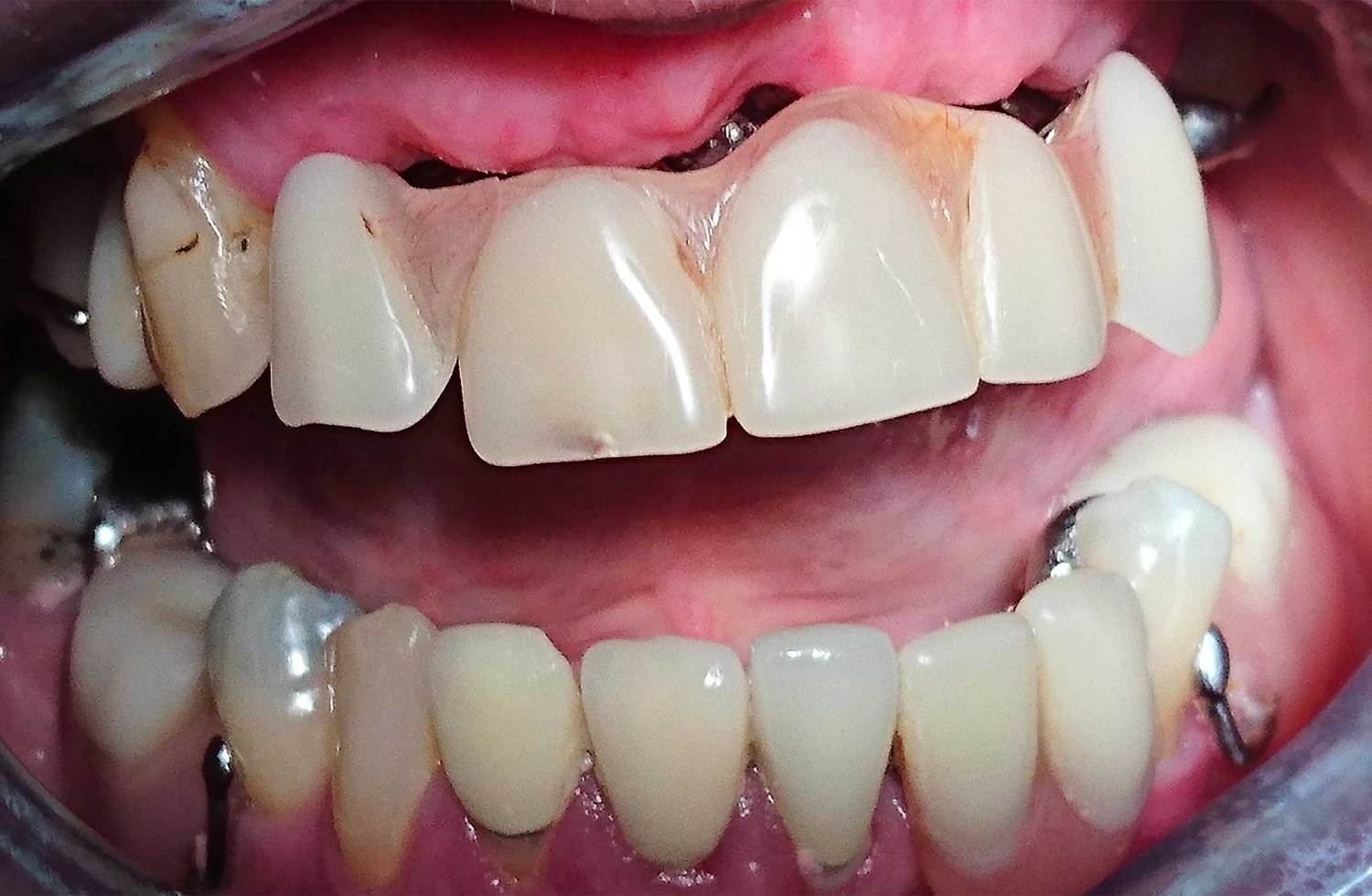 Mr T was an extremely complex case. After years of heavy wear and attrition Mr T was left with shortened and crumbling teeth and an excessive closure of the mouth. After careful treatment planning we began to reposition the jaw relationship using white fillings to rebuild the height of the teeth. Once this new jaw relationship became established sufficient space was achieved to allow for crowning of the anterior teeth. Heavily worn and filled teeth at the back of the mouth were then crowned thus stabilising the new bite and preventing Mr T from overloading his new anterior crowns.