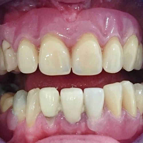 Mrs T was unhappy with the colour and appearance of her upper teeth also her current denture was ill fitting and would move when eating. On discussing different treatment options we decided that by replacing the missing tooth at the front of the mouth with a bridge this would give a superior aesthetic result. The lower teeth were minimally contoured to prevent chipping and the upper anterior teeth crowned and the gap bridged. The old denture was then replace with a new flexi denture the gave a much better fit.